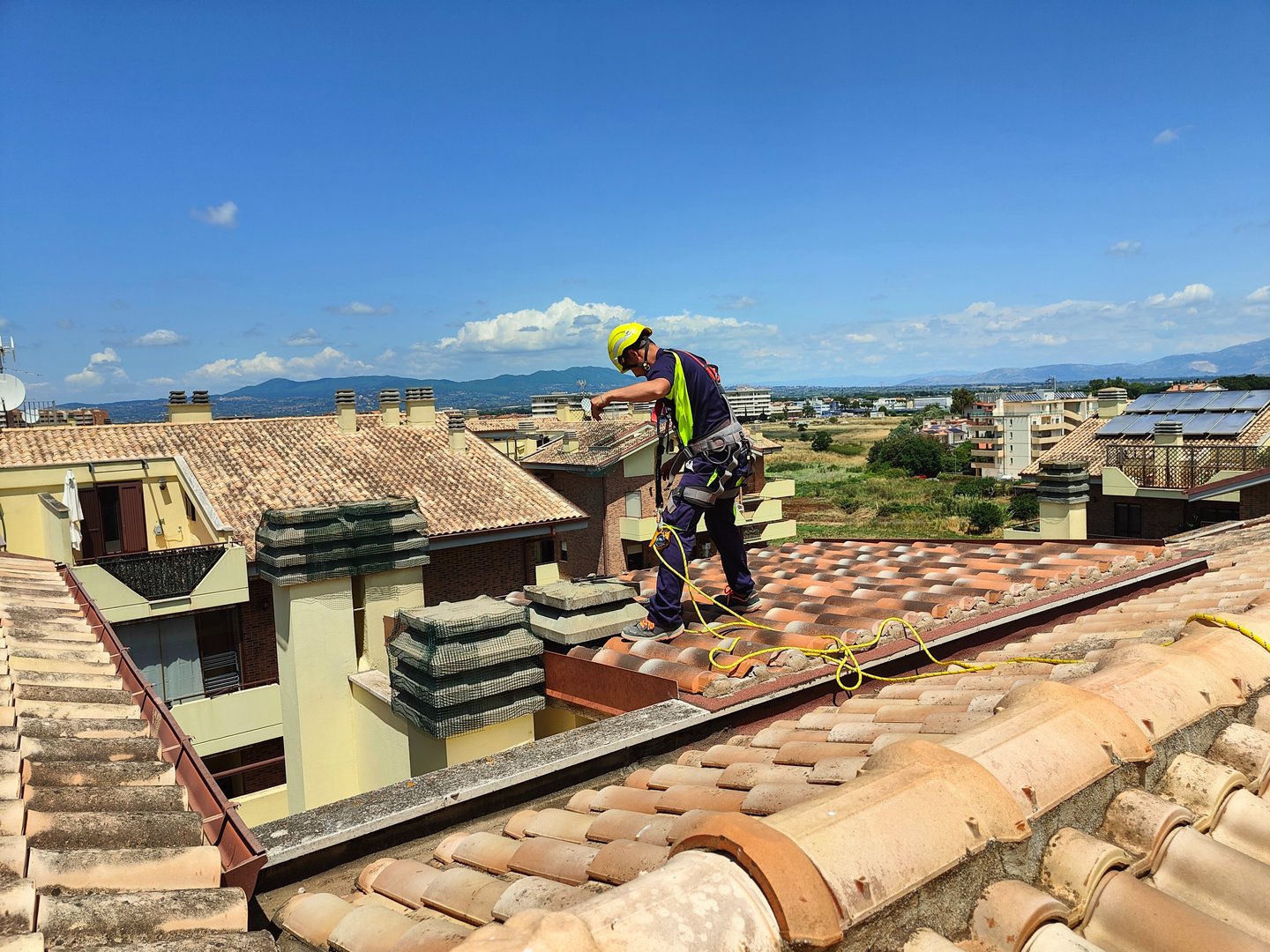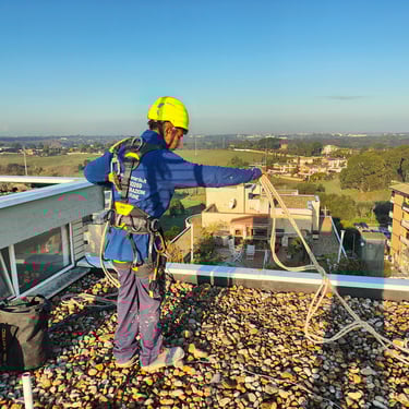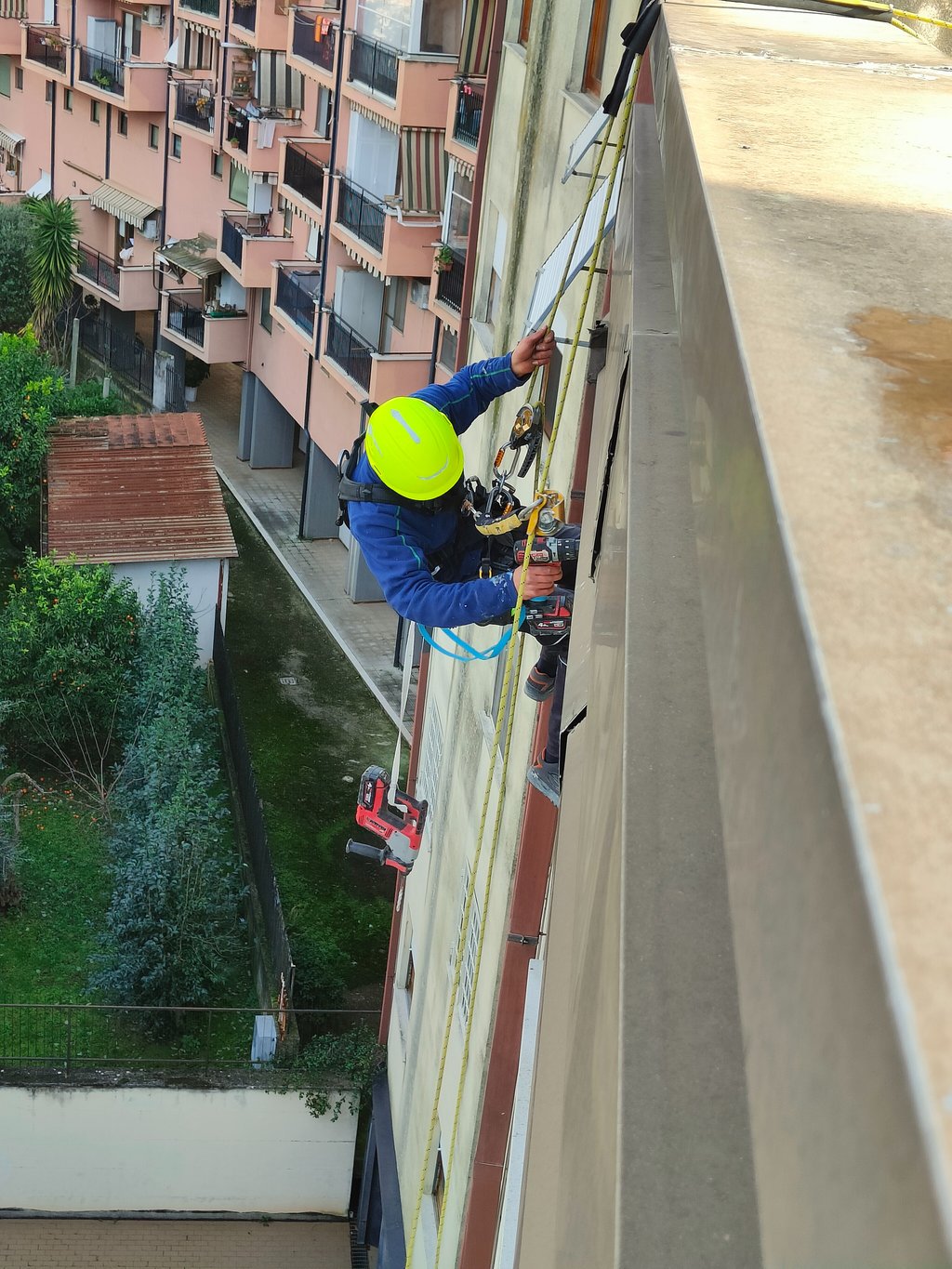 Assolutamente sì. La sicurezza è il pilastro del lavoro in quota e ogni operatore agisce seguendo rigorosi protocolli normativi (D.Lgs 81/08). Ogni tecnico lavora con un sistema a doppia corda: una corda di lavoro e una di sicurezza, ognuna collegata a punti di ancoraggio indipendenti e certificati. Questo significa che, nell'ipotesi remota di un guasto alla prima fune, la seconda entra immediatamente in funzione. Inoltre, tutto il personale deve essere in possesso della certificazione specifica per i lavori in quota e i DPI (Dispositivi di Protezione Individuale) vengono revisionati periodicamente per garantire standard di affidabilità massimi.