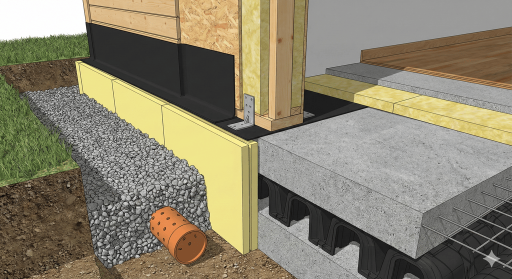 Isolamento perimetrale della platea: Un ulteriore accorgimento è isolare il perimetro della platea stessa. Se la fondazione sporge, si possono incollare pannelli isolanti sul bordo esterno della platea (dal piano di campagna fino al piano pavimento) prima di riempire lo scavo. Questo crea un “cappotto basamentale” che avvolge tutto il contorno della fondazione, mantenendo il calcestruzzo il più possibile nella parte calda dell’edificio.