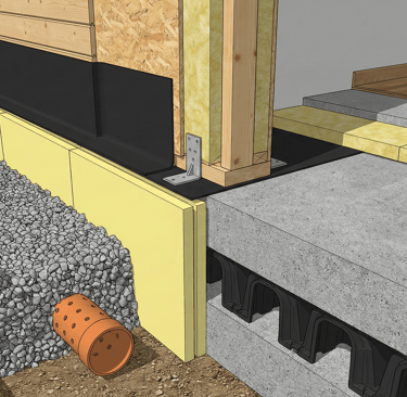 Proprio in corrispondenza del giunto tra fondazione in cemento e parete in legno si colloca una guaina bituminosa impermeabile, che funge da D.P.C. (damp proof course, ossia strato di sbarramento all’umidità). Questo strato è generalmente una membrana bituminosa ardesiata o elastomerica, applicata sopra il cordolo di fondazione e risvoltata sulle sue superfici laterali. La guaina impedisce all’umidità presente nel calcestruzzo (o proveniente dal terreno) di risalire per capillarità nel legno.