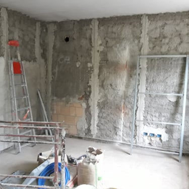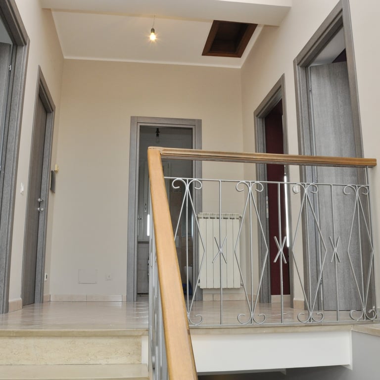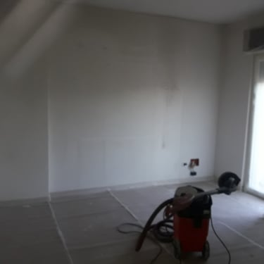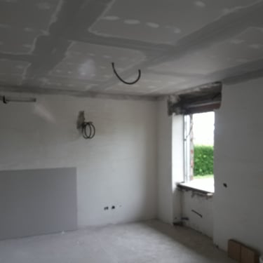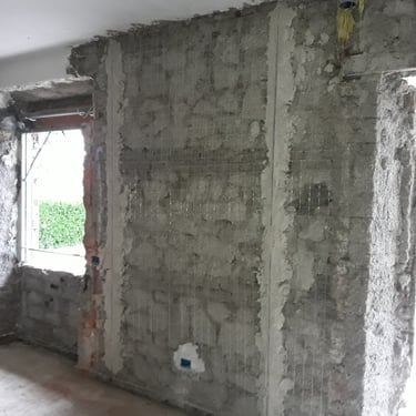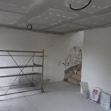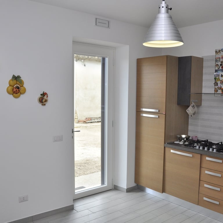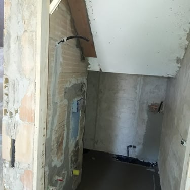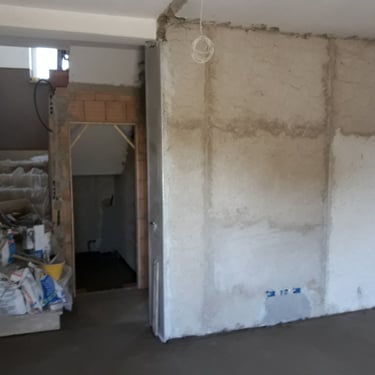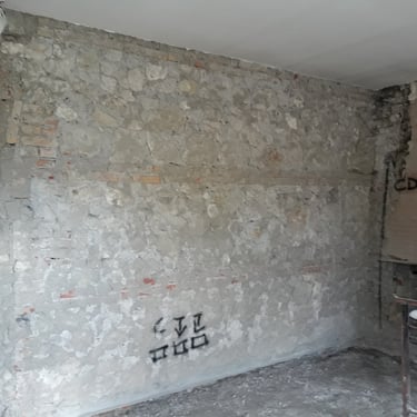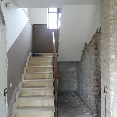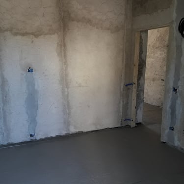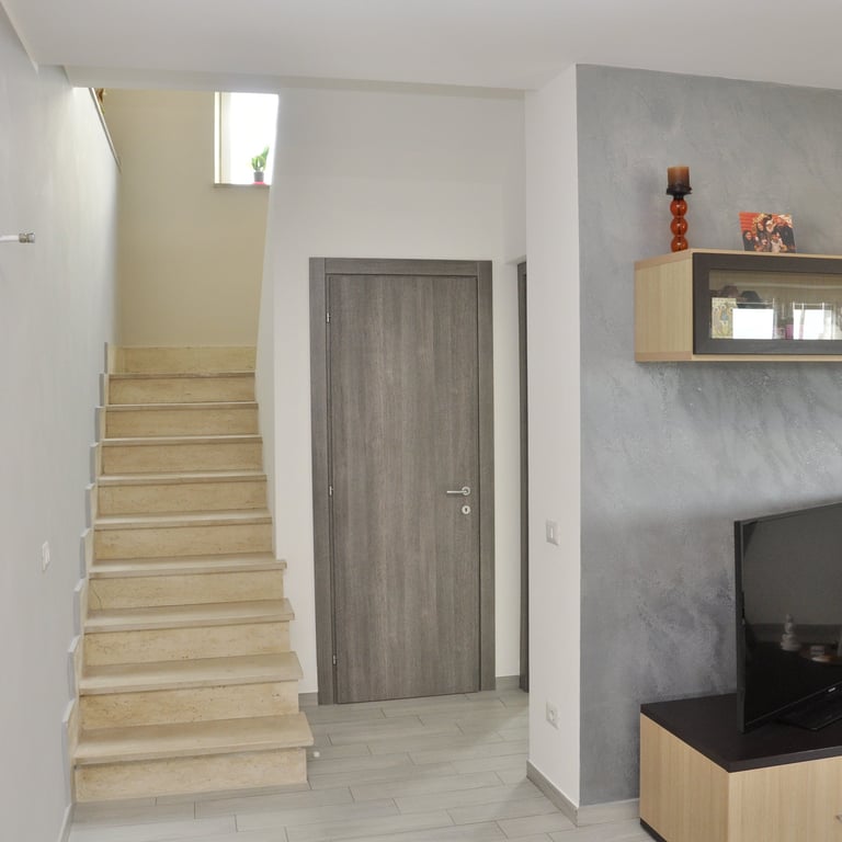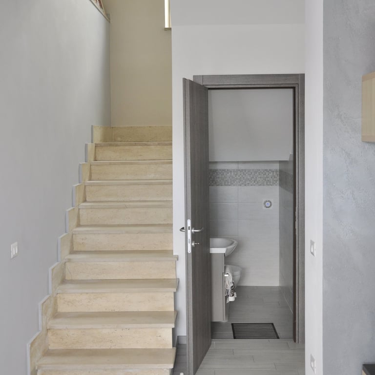 Dopo la completa rimozione delle parti danneggiate, si è provveduto al ripristino degli ambienti utilizzando materiali traspiranti a base di calce, ideali per favorire la salubrità e la durata delle superfici. Successivamente, l’attenzione si è spostata sulle finiture: è stato installato un controsoffitto per migliorare estetica e funzionalità, mentre nello spazio sottoscala è stato realizzato un nuovo bagno, colmando la mancanza di servizi igienici al piano terra. Gli infissi sono stati sostituiti e tutte le superfici sono state tinteggiate con materiali traspiranti, fino alla posa di pavimenti effetto legno grigio, che conferiscono contemporaneità agli ambienti.