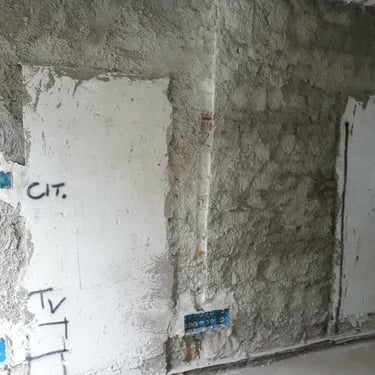 Le pareti portanti laterali, realizzate in pietra a sacco, presentavano un intonaco completamente deteriorato a causa dell’umidità di risalita. Il pavimento, poggiato su un fondo di pozzolana, era anch’esso soggetto a forti infiltrazioni: durante le piogge abbondanti, l’umidità penetrava dai pavimenti, aggravando lo stato di degrado. Per risolvere questi problemi, si è reso necessario procedere alla demolizione totale sia dell’intonaco sia del pavimento, eliminando così le superfici compromesse.